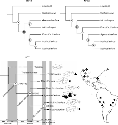 Francois Pujos, Gerry De Iuliis, Bernardino Mamani Quispe, Sylvain Adnet, Ruben Andrade Flores, Guillaume Billet, Marcos Fernandez-Monescillo, Laurent Marivaux, Philippe Münch, Mercedes B. Prámparo and Pierre-Olivier Antoine. 2016. A New Nothrotheriid Xenarthran from the early Pliocene of Pomata-Ayte (Bolivia): New Insights into the Caniniform–Molariform Transition in Sloths. Zoological Journal of the Linnean Society. DOI: 10.1111/zoj.12429