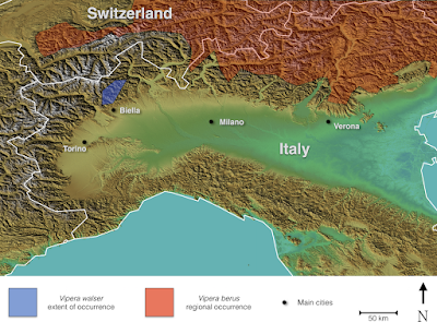 Etymology: Vipera walser sp. nov. is named after, and dedicated to, the Walser people with whom it shares an extraordinary beautiful and wild area of the south-western Alps.  | Figure 8. Currently known extent of occurrence of Vipera walser sp. nov. (in blue) and V. berus (in red) in north western Italy