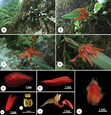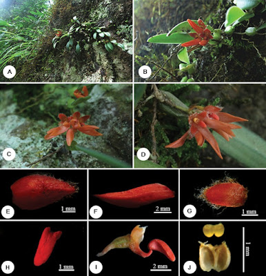 | Figure 2. Bulbophyllum pingnanense J.F. Liu, S.R. Lan & Y.C. Liang. A habitat and habit B–D flower E dorsal sepal F lateral sepal G petal H lip I lip, column, pedicel and ovary, side view J pollinia and anther cap.