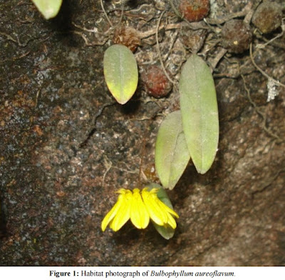 Diagnosis: The species can be differentiated from its allied species only when flowering during the dry months of May and June. The species is easily overlooked because its small bulbs and leaves are similar to those of Bulbophyllum elegantulum J. J. Sm. and B. fischeri Seidenf. Bulbophyllum aureoflavum which can be distinguished by its long, filiform, pendent, 12-flowered scape and by its golden yellowish, elliptic, connate, glabrous, and lateral sepals. Haec species Bulbophyllum elegantulum et B. fischeri similes, rhizome crassis, pseudobulbis subglobosis, scapus filiformis, flores aureo-flavo, sepalum elongato-ovatum, labello profunde sulcate differt.