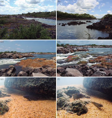 Habitat and natural history: In the region of Volta Grande do Xingu and the lower Rio Iriri, specimens of T. preta were collected in moderate to fast, shallow rapids [Fig. 5(a)–(d)], with clear water and the riverbed composed mainly of large rocks and little accumulated sediment [Fig. 5(e), (f)]. During underwater exploration by snorkelling, individuals of T. preta were observed performing short excursions out of their rocky hideouts, moving alone amidst small rocks and in crevices of large rocks (J. Zuanon. and H. R. Varella, pers. obs).