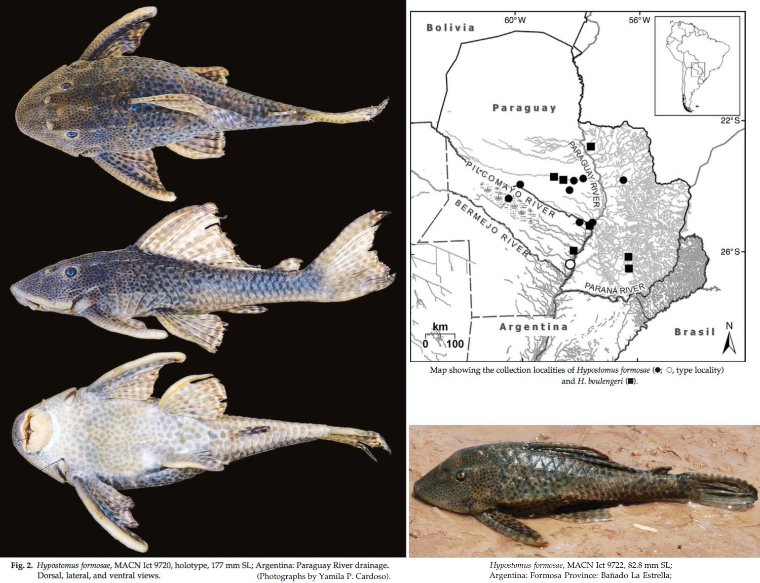 Yamila P. Cardoso, Florencia Brancolini, Ariel Paracampo, Marta Lizarralde, Raphael Covain and Juan I. Montoya-Burgos. 2016. Hypostomus formosae, A New Catfish Species from the Paraguay River Basin with Redescription of H. boulengeri (Siluriformes: Loricariidae). Ichthyol. Explor. Freshwaters. 27(1); 9-23. http://www.pfeil-verlag.de/04biol/pdf/ief27_1_02.pdf