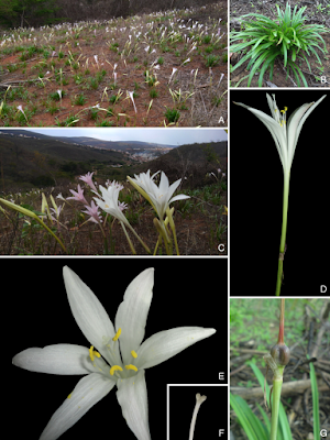 2. Tocantinia dutilhiana Büneker, R. Bastian & C. Costa, sp. nov., (Figs. 2 A–C, 3 A–G). Species morphologice proxima Tocantinia mira et Tocantinia stigmovittata. A prima differt maiori longitudine scapi (usque ad 28 vs. 20.5 cm), numero bractearum inflorescentiae (2 vs. 1), minori longitudine tepalorum (6–7.9 vs. 11– 13 cm), typo stigmae (trifidi vs. capitati) et forma ovulorum (suborbiculariorum vs. clavatocapitatorum). A secunda differt minori longitudine scapi (17–28 vs. 28.5–70.9 cm), hyphanto coloris externae differentis in superiori portione durans anthesis et attingendo minorem longitudinem (pallescente et usque ad 8.5 cm vs. viridescente et usque ad 12 cm), tepalis attingendo minorem longitudinem (usque ad 7.9 vs. 10.8 cm), forma apicis tepalorum verticilli externi (acuti vel attenuati vs. rotundato-cuspitati), forma apicis tepalorum verticilli interni (acuti ad obtusi vs. rotundato-retusi) et lobis stigmaticis in anthese suberectis et plene albis (vs. lobis stigmaticis in anthese patentes et cum marginibus ornatis lineis roseo-vinaceis).