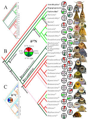 Conclusions Trophic partitioning along elemental/nutritional gradients may provide an important mechanism of dietary segregation and evolutionary diversification among loricariids and perhaps other taxonomic groups of apparently generalist detritivores and herbivores. Evolutionary patterns among the Loricariidae show a high degree of trophic niche conservatism, indicating that evolutionary lineage affiliation can be a strong predictor of how basal consumers segregate trophic niche space.  | Figure 3 Evolutionary patterns of loricariid trophic diversification revealed by assemblage centroid-standardized isotope vector analysis (ACSIVA) of C and N stable isotope data (Figure3; See Additional file 4 : Figures 3–10 for isotope biplots of all local assemblages examined). Cladograms A and B represent the hypothesized ancestral distributions of lineages along a vertical axis of 15 N-enrichment relative to assemblage centroid (pink to red being 15 N-enriched relative to centroid, light green to green being 15 N-depleted relative to centroid). Cladogram A represents a phylogenetic regression of 649 individual vectors (Figure 3A) grouped by genus irrespective of site (see Additional file 2: Figure S1 for a full size version of this phylogeny), and cladogram B represents a regression of 120 mean genus x site vectors (Figure 3 C). Circle plots illustrate the direction of mean genus x site vectors for each genus and statistical significance of the mean vector is indicated by * (Rayleigh’s Z test: P < 0.05) or † (0.10 > P > 0.05; Tables 1, 2). Cladogram C resulted from the same analysis as B, but is color-coded to reflect hypothesized distributions of ancestral lineages along a horizontal axis of 13 C-enrichment relative to assemblage centroid (see Additional file 3: Figure S2 for a full size version of this phylogeny). Oral disk photos by N. K. Lujan or M. H. Sabaj Pérez. | ConclusionsOur study introduces the ACSIVA method of visualizing a consumer’s trophic position relative to sympatric taxa in isotope biplot space, and uses this method to integrate isotopic data both spatially across landscapes and evolutionarily across a phylogeny. Our analysis suggests that Loricariidae should be seen not only as a highly diverse phyletic radiation, but also as an ecological radiation that has diversified along trophic niche dimensions that were heretofore cryptic, yet consistent with previously observed jaw morphological diversity. Current understanding of ecological radiation has been heavily influenced by studies of plants and vertebrates that diversified among island archipelagos and lakes, but there are few prominent examples of ecological radiations in river basins or among the detritivores and herbivores that dominate food webs in tropical rivers and virtually all other ecosystems. The frequently amorphous appearance and low taxonomic resolution achievable for gut contents of most herbivores and detritivores may account for our currently poor understanding of niche relationships within this important trophic guild. Detritivores and herbivores appear to select food items based more on chemical and nutritional qualities than taxonomy or morphology. By estimating molecular patterns of food resource assimilation over time, stable isotope, fatty acid signature analysis, and nutritional physiological approaches provide powerful tools for investigating herbivore and detritivore niche diversification and partitioning. Nathan K. Lujan, Kirk O. Winemiller and Jonathan W. Armbruster. 2012. Trophic Diversity in the Evolution and Community Assembly of Loricariid Catfishes. BMC Evolutionary Biology. DOI: 10.1186/1471-2148-12-124 | 4:16p |