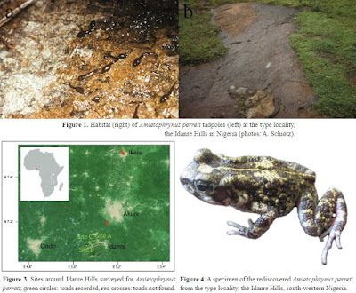 Abstract Perret's toad, Amietophrynus perreti, has not been seen since 1970 and thus believed to be lost. We searched for the species 50 years after its original description and successfully recorded its continued presence at the type locality, where it seems to maintain a viable population. We failed however, to record the species at suitable sites elsewhere and A. perreti could thus indeed be a micro-endemic species, specialized and restricted to the granite inselbergs of the Idanre Hills, Nigeria. We recorded and discuss potential threats and suggest keeping the toad's current conservation status as 'Vulnerable'. We investigated the systematic status of Perret's toad using a mitochondrial fragment of the 16S rRNA gene and could confirm that it is a member of the genus Amietophrynus despite its aberrant larval biology, different to the rest of the genus. In spite of this biological difference, A. perreti is not a phylogenetically isolated lineage, but is nested within a clade of western African Amietophrynus species, such as A. maculatus, A. regularis, A. latifrons and A. togoensis and is sister to the widespread and savannah dwelling A. maculatus.