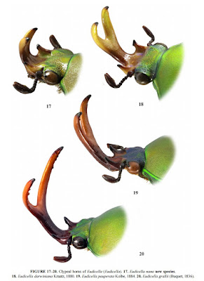 | FIGURE 17–20. Clypeal horns of Eudicella (Eudicella). 17. Eudicella nana new species. 18. Eudicella darwiniana Kraatz, 1880. 19. Eudicella pauperata Kolbe, 1884. 20. Eudicella grallii (Buquet, 1836).