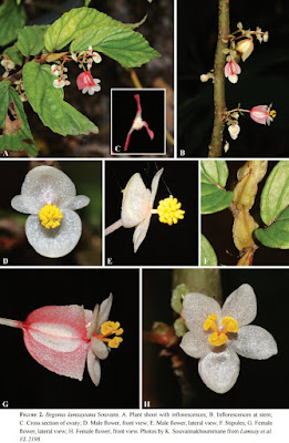 Notes.— This species is similar to Begonia boisiana Gagnep. (found in Vietnam) but differs by having glandular hairs on the stem (vs. glabrous), leaves with bristles on the adaxial surface (vs. glabrous), zygomorphic androecium (vs. actinomorphic) and semi-persistent bracts, margin ciliate, pale green (vs. persistent bracts, margin dentate, pale purple or white). It is similar to B. cucphuongensis H.Q. Nguyen & Tebbitt (found in Vietnam) but differs by having leaves with bristles on the adaxial surface and dense glandular hairs along the veins abaxially (vs. both surfaces glabrous), anther apex emarginated (vs. truncate to rounded), female fl owers with 5 tepals (vs. female fl owers with 3 tepals) and stigmatic band kidney-shaped and papillose (vs. stigmatic lunate).