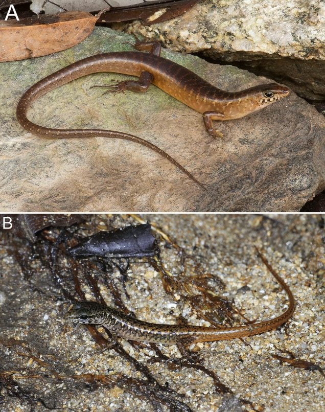 (A) Holotype of Sphenomorphus sungaicolus sp. nov. (LSUHC 11722) from Hutan Lipur Sekayu, Terengganu, Peninsular Malaysia. . Photograph by L. Grismer. (B) Juvenile S. sungaicolus sp. nov. (not collected) from the Korbu Forest Reserve, Perak. Photograph by Z. Dzulkafly. flickr.com