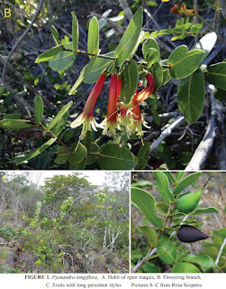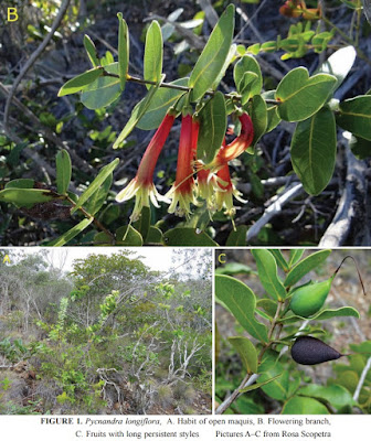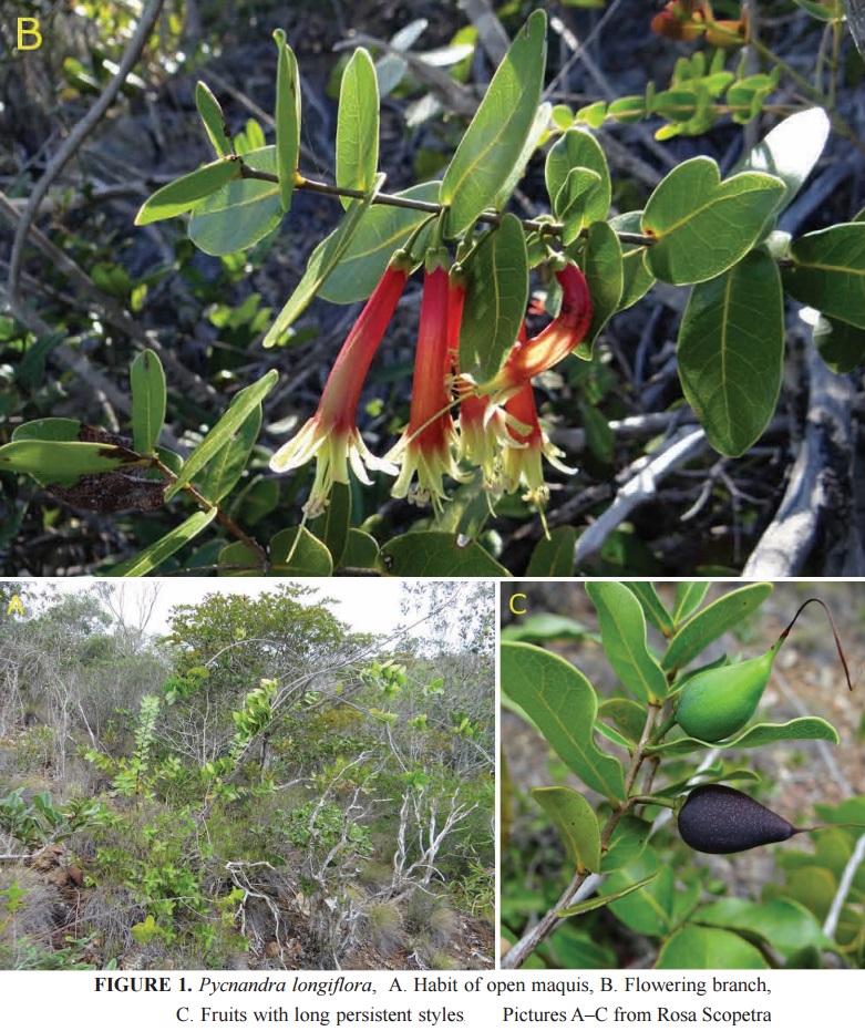 | FIGURE 1. Pycnandra longiflora, A. Habit of open maquis, B. Flowering branch, C. Fruits with long persistent styles.