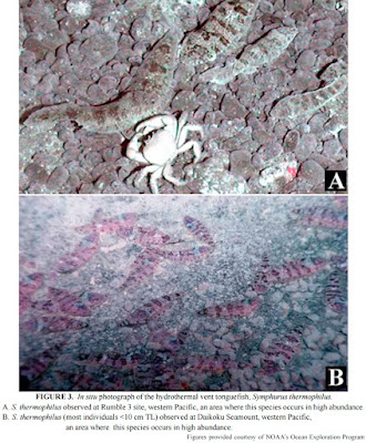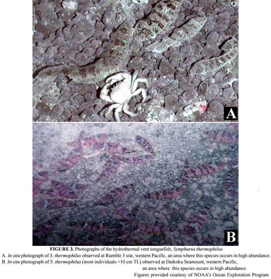 | Symphurus thermophilus Munroe & Hashimoto, 2008 FIGURE 3. Photographs of the hydrothermal vent tonguefish, Symphurus thermophilus. A. In situ photograph of S. thermophilus observed at Rumble 3 site, western Pacific, an area where this species occurs in high abundance. B. In situ photograph of S. thermophilus (most individuals <10 cm TL) observed at Daikoku Seamount, western Pacific, an area where this species occurs in high abundance. C. Photo of recently captured juvenile S. thermophilus taken at the Barnacle Boulders site at Kasuga-2, Mariana Islands.