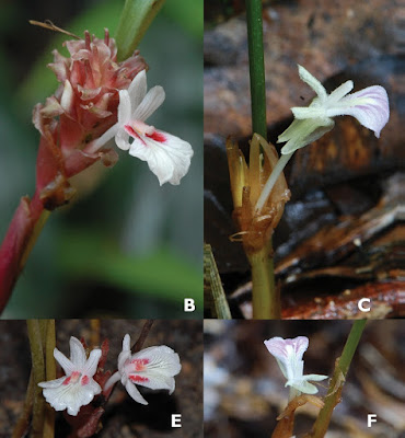 Floral bracts (B) Red and coriaceous in Scaphochlamys pusilla (C) Scarious and marcescent in Borneocola petiolatus. Variegation on labellum (E) White labellum with red streaks beside the band in Scaphochlamys concinna (F) Lilac labellum without coloured streaks beside the band in Borneocola petiolatus.