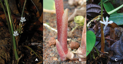 Figure 4.: Bladeless sheaths A Green and coriaceous in Scaphochlamys klossii (Peninsular Malaysia) B Red and coriaceous in Scaphochlamys abdullahii (Peninsular Malaysia) C Papery and marcescent in Borneocola calcicola (Sarawak). |
