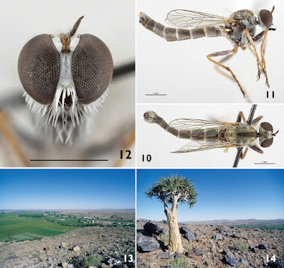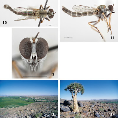 Distribution, phenology and biology: Known only from the type locality. Collected in February (Table 1). Little is known of the biology. Tierberg Nature Reserve is a small conservation area comprised almost entirely of a large rocky hill on the outskirts of Keimoes, a small town located on the north banks of the Gariep (= Orange) River which provides water for agricultural activities in what is otherwise an arid area of the country. Vegetation is sparse and dominated by succulents such as aloes (Figs 13–14). The flies were found resting on hard-baked ground and stones.