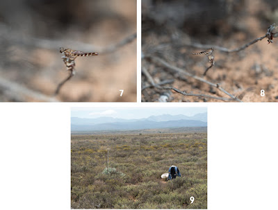 | Figures 7–9. Photographs of Trichoura tankwa and habitat: 7–8 female fly perching on low, dry branch (Morphbank #860609; #860611) 9 Little Karoo veld habitat at De Zeekoe Guest Farm near Oudtshoorn, Eastern Cape, South Africa (33°37'26"S 022°08'39"E).