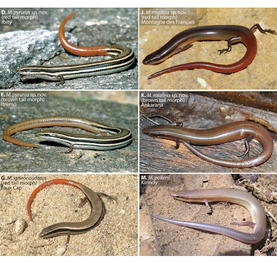 [Herpetology • 2016] Species Delimitation Methods Put Into Taxonomic Practice: Two New Madascincus Species, M. miafina & M. pyrurus, formerly allocated to Historical Species Names (Squamata, Scincidae)  | Madascincus miafina sp. n., a species from dry areas of northern Madagascar, morphologically very similar to M. polleni Madascincus pyrurus sp. n., a montane species endemic to the central highlands of Madagascar. Phylogenetically, M. pyrurus is the sister species of M. igneocaudatus