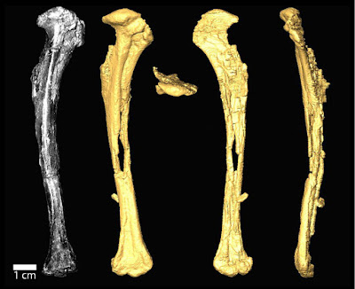 | Figure 3: The holotype specimen of Tingmiatornis arctica, NUFV 1960, a complete left humerus. Photograph (left) and x-ray computed tomography images (right) of the element in caudal, proximal, cranial, and ventral views. |