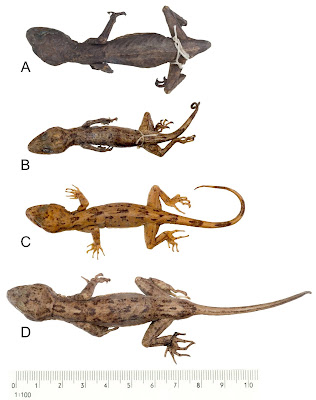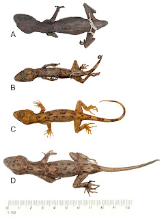 | Fig. 1. Dorsal views of the known specimens of Cyrtodactylus fumosus: (A) NMB-REPT 2662 (holotype, adult female); (B) NMBREPT 2663 (subadult male); (C) BMNH 1895.2.27.7 (adult female); (D) BMNH 1896.12.9.3 (adult male). Photographs by Sven Mecke. BMNH 1895.2.27.7 is also figured (in dorsal view) in Boulenger (1897: Plate VII, Fig. 2).