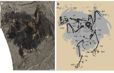 | Figure 1: Cruralispennia multidonta holotype (IVPP V21711). (a) Photograph; (b) line drawing. ca, caudal vertebra; cv, cervical vertebra; il, ilium; is, ischium; lad, left alular digit; lco, left coracoid; lde, left dentary; lfe, left femur; lhu, left humerus; lmd, left major digit; lpd; left pedal digits; lra, left radius; lta, left tarsometatarsus; lti, left tibiotarsus; lul, left ulna; pu, pubis; py, pygostyle; qu, quadrate; rco, right coracoid; rfe, right femur; rhu, right humerus; rmd, right major digit; rpd, right pedal digits; rra, right radius; rsc, right scapula; rta, right tarsometatarsus; rti, right tibiotarsus; rul, right ulna; sk, skull; st, sternum; sy, synsacrum; tv, thoracic vertebra. The white circles (numbered 1–5) and box indicate the locations of the feather and histological samples, respectively. Scale bar, 10 mm. |