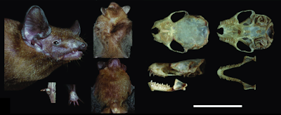 Keywords: Vespertilioninae; Tylonycteris; DNA phylogeny; taxonomy; biogeography  | T. robustula Thomas, 1915 (corrected taxon name is Tylonycteris tonkinensis Tu, Csorba, Ruedi & Hassanin sp. nov.), holotype, IEBR-VN11-0055. Head profiles, ventral and dorsal views, fleshy pads at the base of the thumb and on the sole of the foot, and different views of the skull (dorsal, ventral and lateral). Scale = 10 mm. |