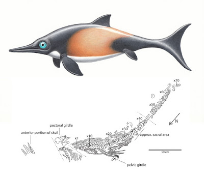 Holotype and only specimen: PMO 222.655, an articulated, partial skeleton consisting of an incomplete rostrum, the dorsal and preflexural vertebrae, the right pectoral girdle and forefin, most of the pelvic girdle and both femora.