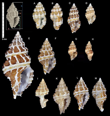 | Fig. 2. Species of the Hemilienardia ocellata complex. The SEM image with no letter denoted shows standard measurements. A–D. Hemilienardia ocellata (Jousseaume, 1884). A–B. Syntype, MNHN IM-2000-3128, Mauritius, 4.0 mm. C. Loyalty Islands, Lifou, Baie du Santal, Atelier Lifou 2000, stn 1429, 20°47.5' S, 167°07.1' E, 8–18 m, 4.4 mm. D. New Caledonia, Secteur de Koumac, Expedition Montrouzier, stn 1319, 20°44.7' S, 164°15.5' E, 15–20 m, 3.6 mm. E–F. Hemilienardia acinonyx sp. nov. E. Holotype, MNHN IM-2013-33593, Philippines, 8.1 mm. F. Loyalty Islands, Lifou, Baie du Santal, Atelier Lifou 2000, stn 1441, 20°46.4' S, 167°02.0' E, 20 m, 5.4 mm. G–H. Hemilienardia lynx sp. nov., holotype, MNHN IM-2013-5489, Papua New Guinea, 2.75 mm. I–M. Hemilienardia pardus sp. nov. I. BMOO 17147, Society Islands, Moorea. K. Holotype, MNHN IM-2000-31661, 5.8 mm. L–M. Loyalty Islands, Lifou, Baie du Santal, Atelier Lifou 2000, stn 1454, 20°56.65' S, 167°02.0' E, 15–18 m, 5.2 mm. |