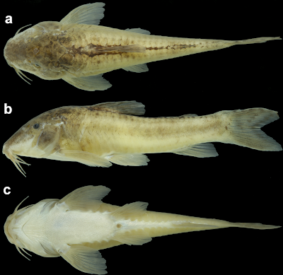 | Fig 3. Aspidoras mephisto, holotype, MNRJ 48268, 45.6 mm SL, in dorsal (a), lateral (b) and ventral (c) views. |
