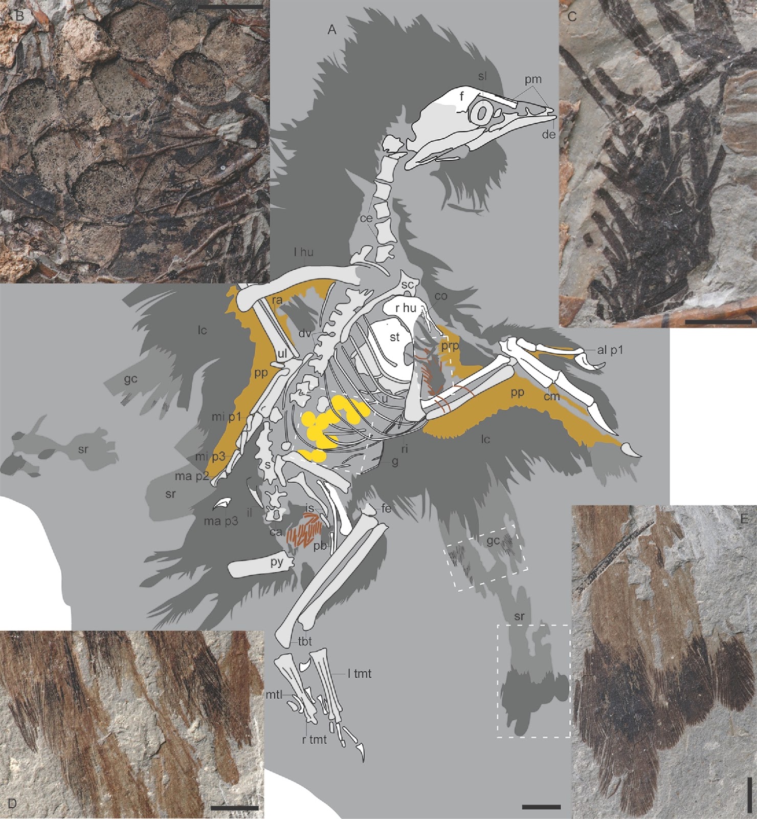 | Figure 2. (a) Interpretative drawing of Eoconfuciusornis indet. STM7-144; (b) ovarian follicles; (c) remnants of the internal structure of the propatagium with underlying feathers; (d) preserved pattern in the greater coverts; (e) secondary remiges. Scale bar equals 10 mm in (a) and 5 mm in all insets. Anatomical abbreviations: al, alular metacarpal; ca, caudal vertebrae; ce, cervical vertebrae; cm, carpometacarpus; co, coracoid; cv, wing coverts; de, dentary; dv, dorsal vertebrae; f, frontal; fe, femur; g, gastralia; gc, greater coverts; hu, humerus; il, ilium; is, ischium; l, left; lc, lesser coverts; ma, major metacarpal; mc, marginal coverts; mi, minor metacarpal; mt, metatarsal; p1-3, manual phalanges; pb, pubis; pm, premaxilla; pp, postpatagium; prp, propatagium; py, pygostyle; ra, radius; ri, ribs; s, synsacrum; sc, scapula; sl, scleral ossicles; sr, secondary remiges; st, sternum; tbt, tibiotarsus; tmt, tarsometatarsus; ul, ulna; u, uncinate process. Yellow indicates preserved remnants of maturing ovarian follicles; dermal and epidermal tissue remnants are indicated in tan; remains of collagen fibres are brown. Dark grey indicates body feathers and the dorsal layer of wing coverts; light grey indicates the greater coverts and secondaries with preserved patterning. White dashed boxes represent areas enlarged in insets. |