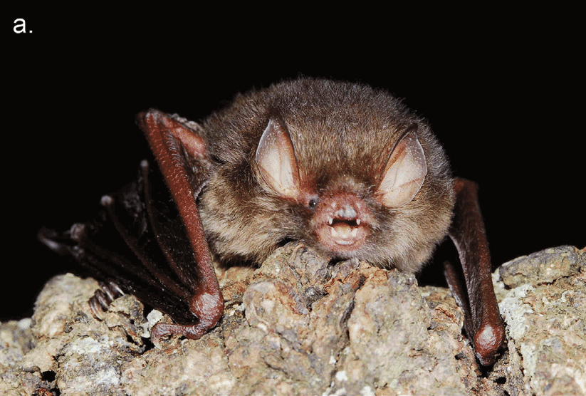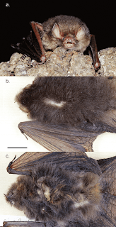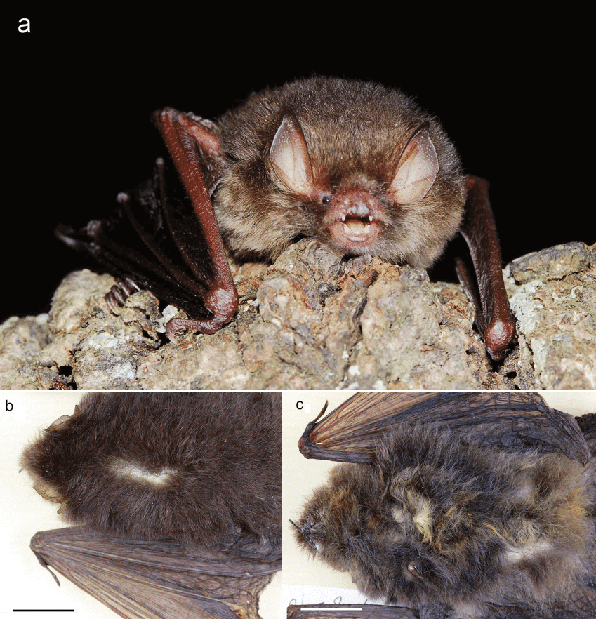 | FIG. 4. Photographs of Kerivoula furva sp. n., showing (a) a live individual (no voucher) as well as (b) dorsal and (c) ventral views of the skin specimen of holotype (NMNS 17595).