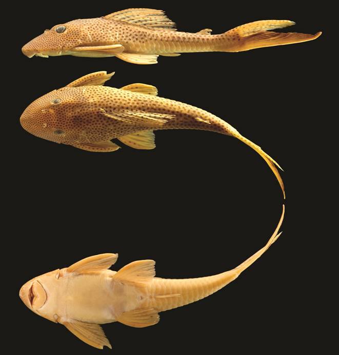 | Fig. 1 Holotype of Aphanotorulus rubrocauda, INPA 33666, 150.5 mm SL, Brazil, Amazonas State, Apuí Municipality, Resex do Guariba, rio Aripuanã drainage, tributary of the rio Madeira basin, in lateral, dorsal, and ventral views. |