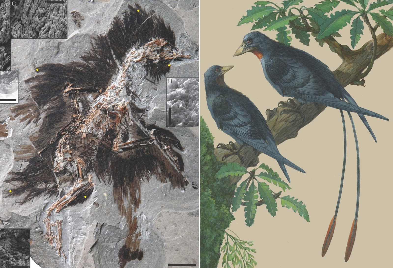 | Figure 1. (a) Photograph of Eoconfuciusornis indet. STM7-144, preserved in right lateral view; scale bar equals 20 mm. Inset SEM images (all scale bars equal 2 μm); (b) left-wing coverts (sample 2_2) preserving black eumelanosomes; (c) coronal feathers (sample 2_1) preserving grey eumelanosomes; (d) dark spot of secondaries (sample A) preserving black eumelanosomes; (e) light part of secondaries (sample C) preserving grey mouldic eumelanosomes; (f) tail feathers (sample 2_3) preserving black eumelanosomes; (g) crural feathers (sample 2_4) preserving grey eumelanosomes; (h) submalar feathers (sample G) preserving phaeomelanosomes. Yellow dots indicate location of each sample. |