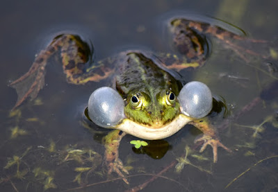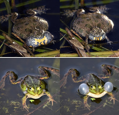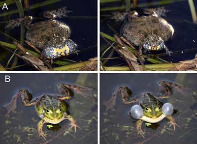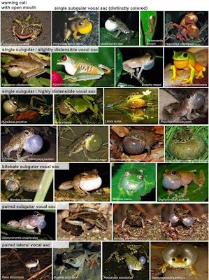 | FIGURE 2. Vocal sac variation in anurans. Except for Ceratophrys cranwelli (emitting a warning call with open mouth) and the pictured specimens of Hyperolius (emitting advertisement calls with aggressive components in male-male combat) all pictured specimens are emitting advertisement calls. Phrynobatrachus alleni is suspected to use its yellow vocal sac for visual signalling, and a visual function is also probable for the bright white vocal sacs of the two Guibemantis species, and of other frogs. All hyperoliids (such as Hyperolius viridiflavus shown here) have gular glands on the vocal sac that might have a visual function, in addition to probably producing pheromones (Starnberger et al. 2013). Note that the distinction between vocal sac types is not always clear; for instance, the vocal sacs of Rana temporaria and Boophis tsilomaro can be considered as partially paired subgular and partially paired lateral.