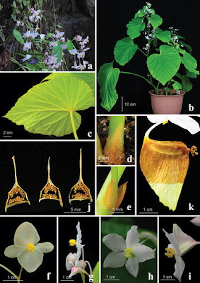 | Fig. 2 Begonia myanmarica C.-I Peng & Y. D. Kim. a Habit and habitat. b Cultivated plant at anthesis. c Leaf abaxial view. d Stipule. e Bract. f Male flower, face view. g Male flower, side view. h Female flower, face view. i Female flower, side view. j Cross section of ovaries. k Capsule