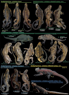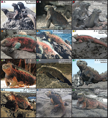 Fig 7: Photographic plate showing the different subspecies of Marine Iguana (living mature males exclusively). (A) Amblyrhynchus cristatus nanus, Genovesa, (B) A. c. hayampi subsp. nov., Marchena, (C) A. c. sielmanni, Pinta, (D, E) A. c. venustissimus, Española and Floreana, respectively, (F) A. c. trillmichi subsp. nov., Santa Fé, (G) A. c. hassi, Santa Cruz, (H) A. c. cristatus, Fernandina, (I) A. c. cristatus, Isabela, (J) A. c. mertensi, San Cristóbal, (K) A. c. godzilla subsp. nov., San Cristóbal, (L) A. c. wikelskii subsp. nov., Santiago.