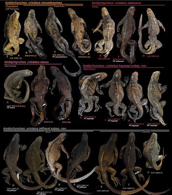 Fig 5: Overview of the phenotypic diversity among Amblyrhynchus cristatus subspecies: (A–C) Amblyrhynchus cristatus hassi from Santa Cruz (SFM 57412, 57407, 57408) (D–F) A. c. wikelskii subsp. nov. from Santiago (SFM 57447, 57448, 57446), (G–N) A. c. cristatus from Fernandina (OUMNH 6176, CAS 11512, 11511, 11510) and Isabela (SFM 64179, 11258, 65996, 65998), (O–Q) A. c. mertensi from San Cristóbal (SFM 57427, 57430, 57424), (R) A. c. trillmichi subsp. nov. (uncollected living specimen), (S) A. c. godzilla subsp. nov. (uncollected living specimen). HT: holotype, NT: neotype, PT: paratype. |