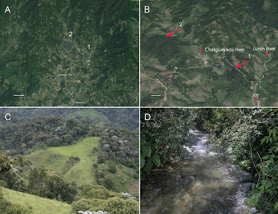 | Figure 2. Atelopus longirostris habitat at Junín, Provincia Imbabura: (A–B) Aerial views from an altitude of 11.09 and 2.89 km, taken from Google, digital Globe; red arrows indicate collection sites at site 1, the reserve of Cabañas EcoJunín (right) and site 2, a private property (left), scale = 667 and 108 m in A and B, respectively. In figure B note the nearly complete disconnection between the private forest and Chalguayacu river caused by forest clearing, (C) forest at reserve of Cabañas EcoJunín, (D) Chalguayacu river.