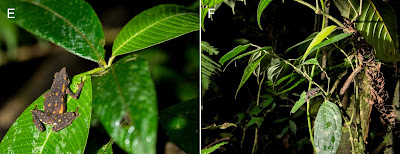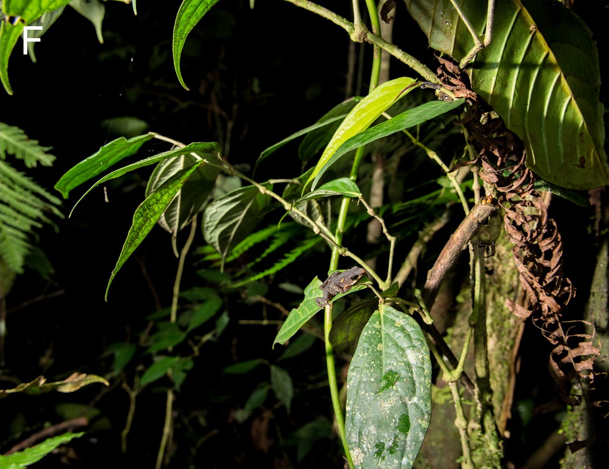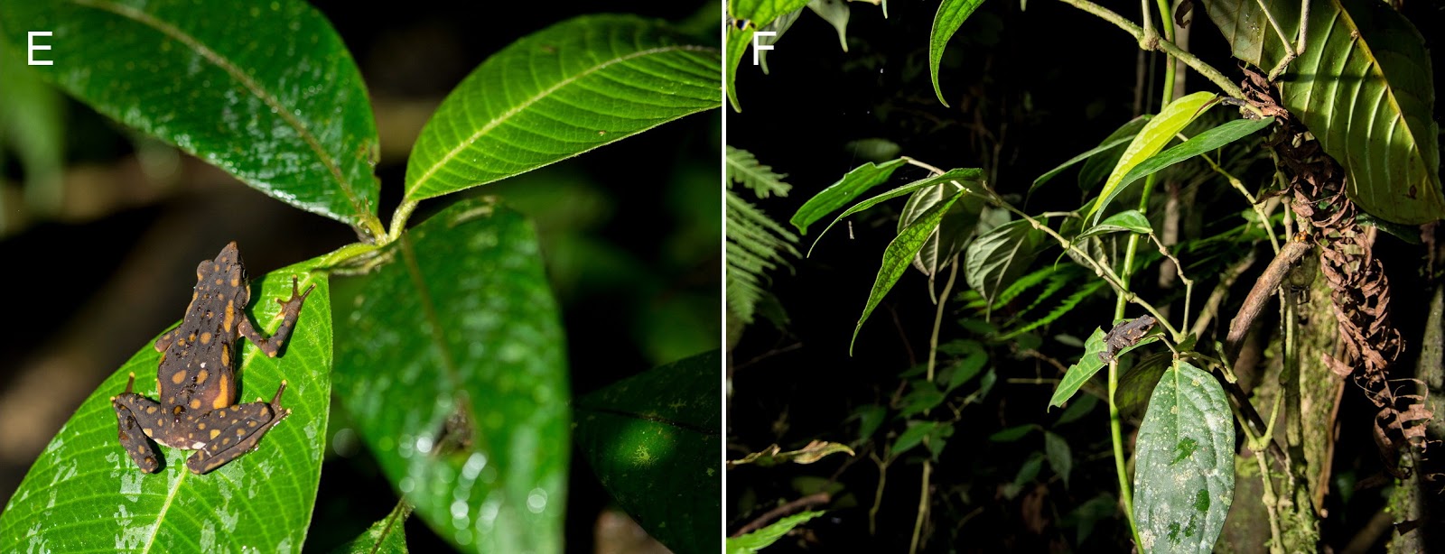 | Figure 2. Atelopus longirostris habitat at Junín, Provincia Imbabura: ((E) female CJ (sc 5521) on a leaf of Rubiaceae, (F) male CJ (sc 5582) on a leaf of Piperaceae.