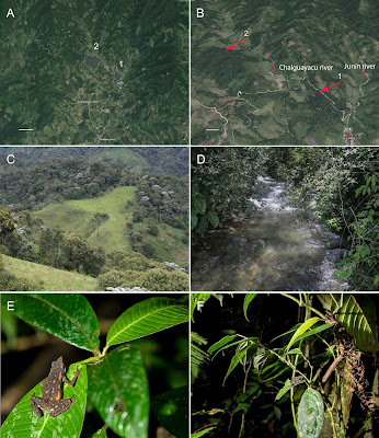 | Figure 2. Atelopus longirostris habitat at Junín, Provincia Imbabura: (A–B) Aerial views from an altitude of 11.09 and 2.89 km, taken from Google, digital Globe; red arrows indicate collection sites at site 1, the reserve of Cabañas EcoJunín (right) and site 2, a private property (left), scale = 667 and 108 m in A and B, respectively. In figure B note the nearly complete disconnection between the private forest and Chalguayacu river caused by forest clearing, (C) forest at reserve of Cabañas EcoJunín, (D) Chalguayacu river, (E) female CJ (sc 5521) on a leaf of Rubiaceae, (F) male CJ (sc 5582) on a leaf of Piperaceae. Photos C–D by EET, E–F by GPO. |