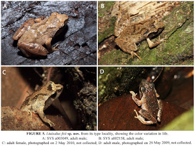 Etymology. The specific epithet “feii” is a patronymic noun in the genitive singular; derived from the name of Professor Liang Fei of the Chengdu Institute of Biology, Chinese Academy of Sciences, China, in recognition of his long-term great contribution to the advancement of amphibian research in China. For the common name, we suggest “Fei’s Small Tree Frog” in English, “Fei Shi Xiao Shu Wa” in Chinese.