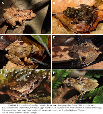 | FIGURE 6. A: a male individual of Liuixalus feii sp. nov., photographed on 2 May 2010, not collected; B: L. hainanus from Diaoluoshan, NR Hainan (type locality); C: L. ocellatus from Wuzhishan NR, Hainan (type locality); D: L. romeri from Hong Kong (type locality); E: paratype of L. calcarius from Cat Ba Island, Vietnam; F: L . cf. romeri from Mt. Shiwan, Guangxi. |