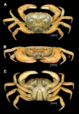 | Himalayapotamon garhwalense n. sp., holotype male (ZSI, WRC-C. 1178). A, dorsal view; B, frontal view; C, ventral view. Scale bar = 10 mm. |