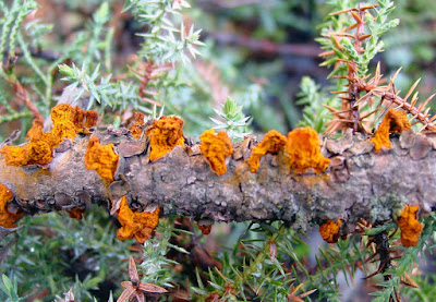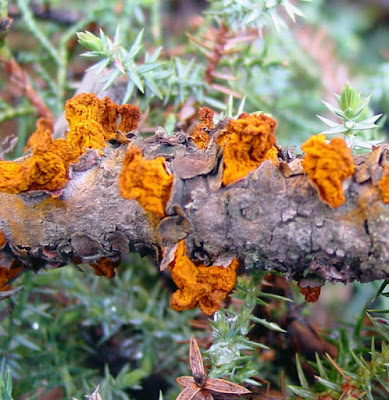 | Gymnosporangium przewalskii on Juniperus przewalskii (holotype, BJFC-R01859). Telia emerge from the branches in saffron yellow gelatinous form under moist conditions. |