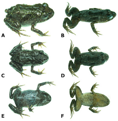 Resumen: Se describe una nueva especie de Bryophryne de los bosques nublados del Departamento de Cusco en Perú. Los especímenes fueron colectados a una elevación de 2795–2850 m en el Área de Conservación Privada Ukumari Llaqta, valle del río Quispillomayo, provincia de Paucartambo. La nueva especie se diferencia fácilmente de todas las demás especies de Bryophryne por tener coloración verde en la espalda y manchitas azuladas en los flancos y las superficies ventrales. Los especímenes se caracterizan por carecer de procesos vomerianos y de anillo y membrana timpánicos, y por poseer piel dorsal finamente granulada, pliegues dorsolaterales discontinuos, piel en los flancos verrugosa, y cubierta de verrugas en areola en las partes ventrales, y por carecer de membrana basal y quillas laterales en los dedos. La nueva especie tiene una longitud hocico–cloaca (LHC) de 14.2–16.9 mm en tres machos y de 22.2–22.6 mm en dos hembras, siendo menor que todas las demás especies de Bryophryne excepto por B. abramalagae. Distancias genéticas bajas para el gen mitocondrial 16S, similitud morfológica con otras especies de Bryophryne y distribución geográfica indican que la nueva especie forma parte del género Bryophryne. Bryophryne phuyuhampatu sp. n. se conoce únicamente de su localidad tipo, un bosque nublado en el valle del torrente Quispillomayo, en la parte alta de la cuenca del río Nusiniscato.