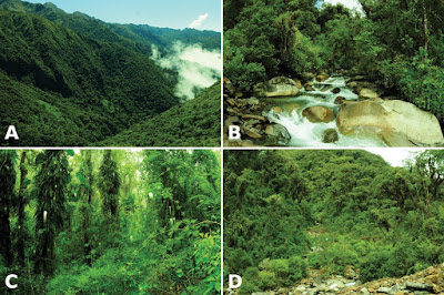 | Figure 5. Collection localities of Bryophryne phuyuhampatu sp. n. in the upper Quispillomayo River valley A lookout from 3050 m a.s.l.: frogs were found under mosses, leaves and rocks in the cloud forest along the Quispillomayo River B such as the type locality at 2850 m a.s.l. C and disturbed forest at the confluence with a stream at 2795 m a.s.l. D Photographs by A. Catenazzi. |
