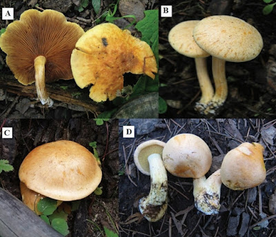 | Gymnopilus swaticus J. Khan, Sher & Khalid Basidiomes in natural habitat. A‒B. Holotype collection, C. SWAT000134, D. LAH35300.