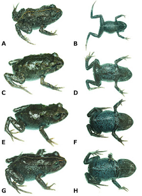 | Figure 4. Dorsolateral and ventral views of four paratypes of Bryophryne phuyuhampatu sp. n. showing variation in dorsal and ventral coloration. Male CORBIDI 18225, SVL = 14.2 mm A, B Male MUBI 14655, SVL = 15.9 mm C, D Female CORBIDI 18224, SVL = 22.6 mm E, F. Female MUBI 14654, SVL = 22.2 mm G, H Photographs by A. Catenazzi. |
