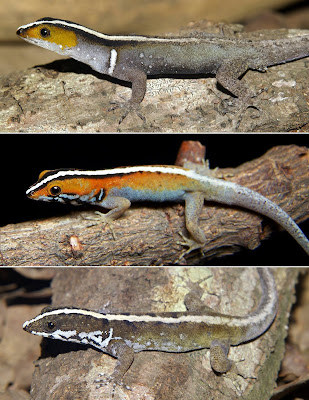 | FIGURE 4. Male specimens of Gonatodes rayito sp. nov. (top, photo of the holotype by JEGP); G. vittatus (middle, photo by Marcial Quiroga-Carmona) from Valencia, Carabobo; and G. petersi (bottom, photo by JEGP) from Finca El Deseo, Zulia. All localities are in Venezuela |