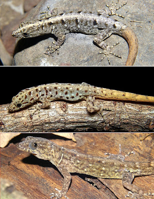 | FIGURE 5. Female specimens of Gonatodes rayito sp. nov. (top, photo of MCNG 2237 by JEGP), G. vittatus (middle, photo by Marcial Quiroga-Carmona), from Valencia, Carabobo; and G. petersi (bottom, photo by JEGP), from Finca El Deseo, Zulia. All localities are in Venezuela. |
