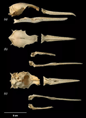 | Fig. 8. Cranial skeletal elements of the holotype of Kohatu Shag (Leucocarbo septentrionalis; NMNZ S.34434). (a) Lateral view; (b) Dorsal view; (c) Ventral view. |