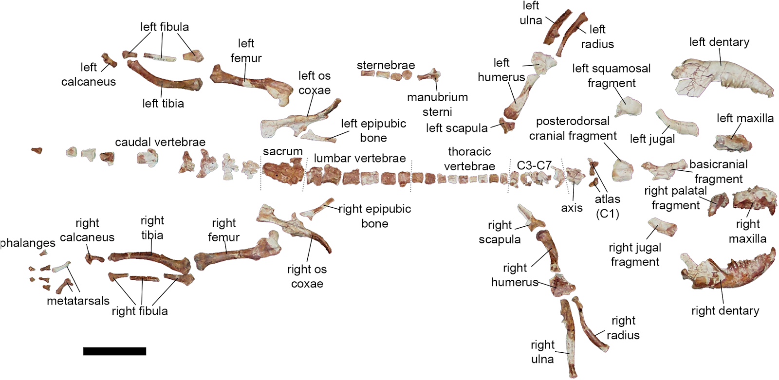 | Fig 1. Holotype skeleton of Anatoliadelphys maasae (AÜJM 2002–25). Scale bar = 5 cm. |