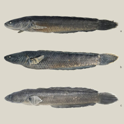 | Fig. 1. Channa shingon; Erganya, Yingjiang; Jieyanghe River: a, KIZ 2014005982, 89.7 mm SL, holotype; b, KIZ 2014005980, 90.2 mm SL, paratype, reversed; c, KIZ 2014005971, 89.4 mm SL; Cangyuan; Nangunhe River. |